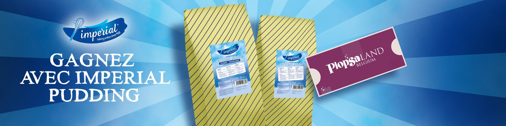 Rendez chaque moment dessert exceptionnel. Du 20 octobre au 31 décembre 2025*, pour l’achat d’au moins 2 sacs de Imperial Pudding (25 kg, Classique à cuire ou Instant), vous recevrez non seulement un ticket gratuit pour Plopsaland, mais aussi -10% de réduction par sac.